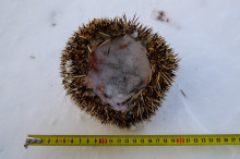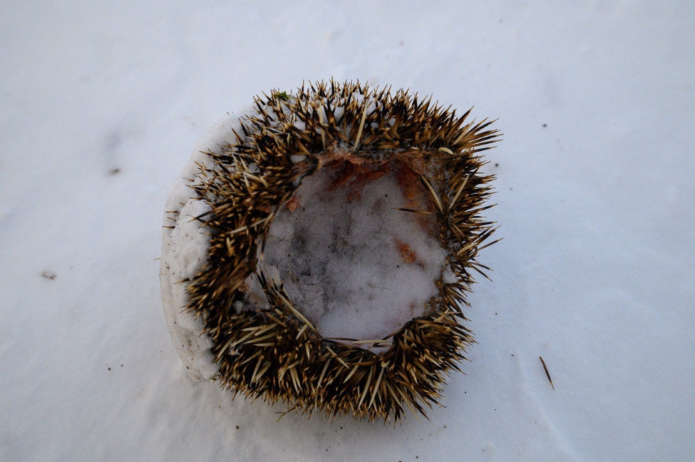 На проложенном снегоходом полотне, по которому проходил маршрут, были обнаружены останки взрослого амурского ежа — зверька, который проводит зиму в состоянии глубокой спячки. Многочисленные следы соболя вокруг позволили восстановить лесную драму.