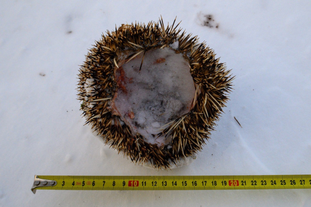 Еж устроился на зимовку в углублении под корнями растущего дерева, утеплив гнездо сухими листьями и травой. Здесь его и нашёл маленький хищник. Выкатив спящего бедолагу на нартовик, соболь расправился с ним, а затем приступил к трапезе. По всей видимости, сильный мороз и глубокое оцепенение полностью парализовали ежа, лишив его возможности к сопротивлению. Хищник аккуратно выел изнутри мягкие ткани, оставив в целости покрытую иглами шкуру.
